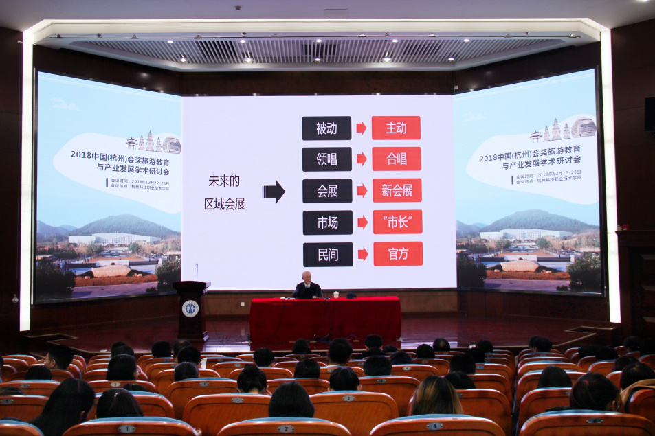 2018中国(杭州)会奖旅游教育与产业发展学术研讨会由浙江省会展学会、杭州市会议与奖励旅游业协会和我校联合主办,我校社科联、旅游学院、会奖经济研究所共同承办。会议吸引了来自会奖旅游政产学研各界约30家机构的70余位嘉宾前来参会。大会以“国际化与会奖旅游”为主题,围绕会奖特色人才培养模式改革与课程建设与文化旅游视野下的国际会议目的地建设两大议题展开。