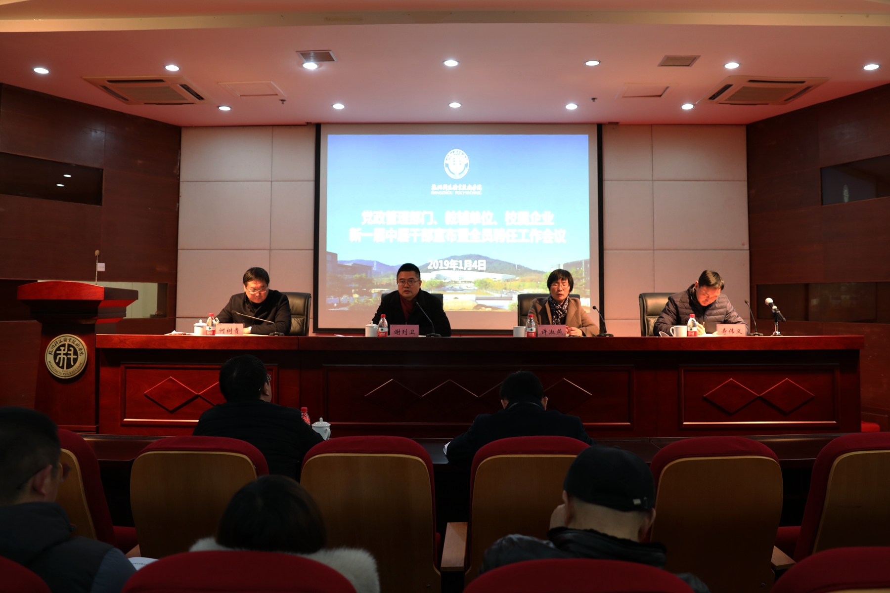 1月4日下午,我校召开党政管理部门、教辅单位、校属企业新一届中层干部宣布暨全员聘任工作会议。校党委书记谢列卫、校长许淑燕、校党委副书记何树贵、副校长寿伟义出席会议,党政管理部门、教辅单位、校属企业全体在编教职工及各二级学院(部)院长(主任)、党总支书记参加了会议。会议由校长许淑燕主持。