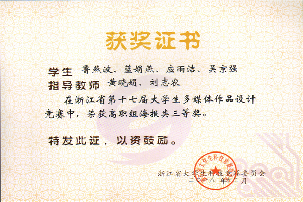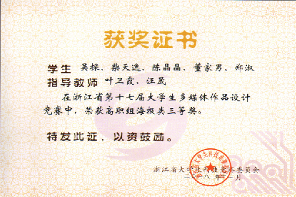 近日,浙江省第十七届大学生多媒体作品设计竞赛成绩揭晓。由叶卫霞、汪晟两位老师指导,陈欣悦、盛麟珈、王锦嬣三位同学的作品“探索无界”获得了大赛一等奖;由黄晓娟、刘志农老师指导,鲁燕波、蓝娟燕等同学的作品“有际无界”和叶卫霞、汪晟老师指导,吴探、柴天逸等同学的作品“爱无界”获得了大赛三等奖。学校在本次大赛中实现了一等奖零的突破。