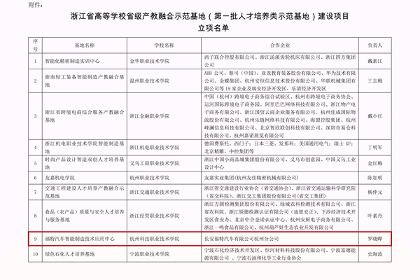 2019年1月15日,浙江省教育厅公布了浙江省高等学校省级产教融合示范基地(第一批人才培养类示范基地)建设项目立项名单,我校福特汽车智能制造技术应用中心成功立项。