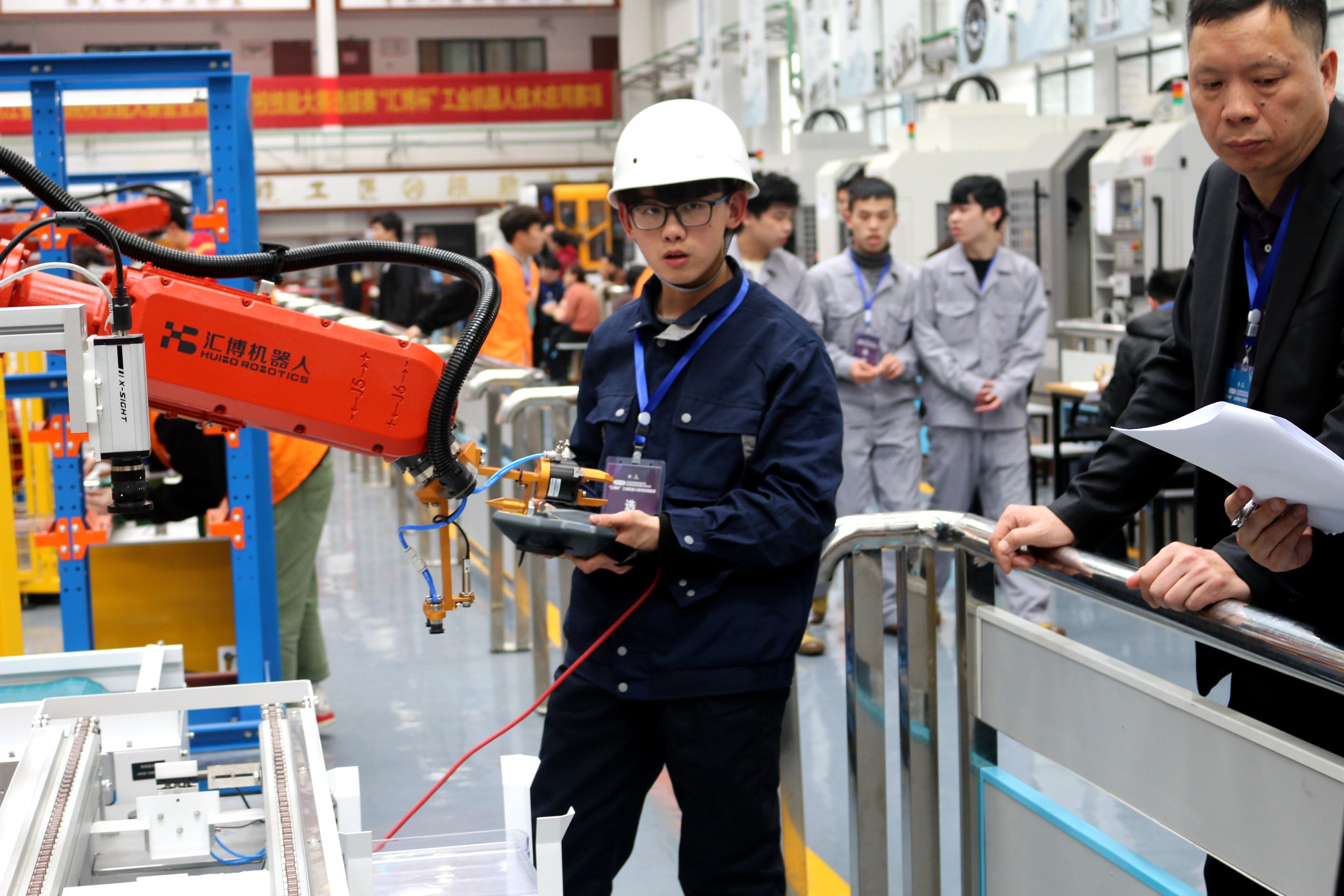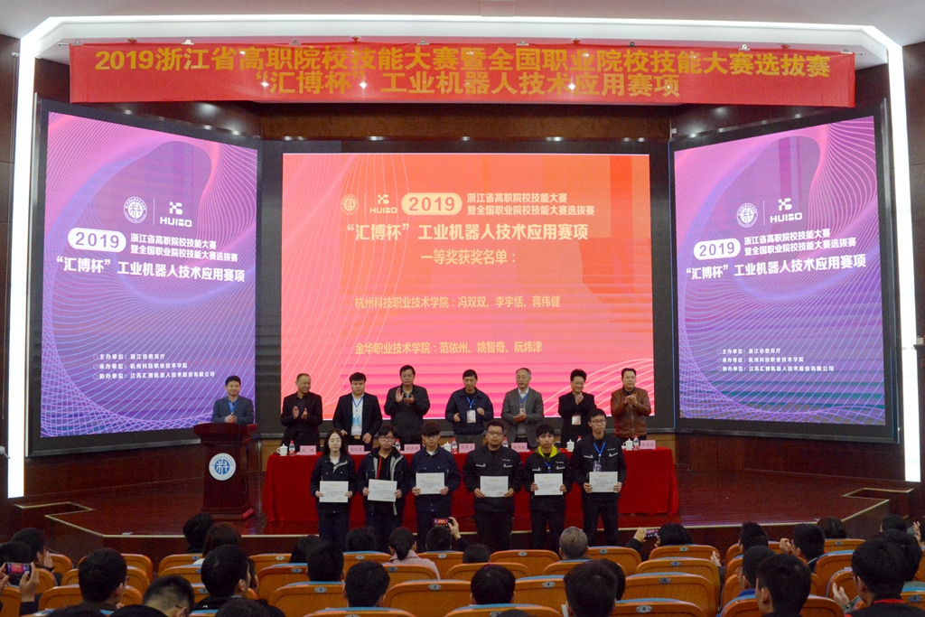 本次比赛共吸引全省13所高职院校24支队伍参加。经过激烈角逐,我校由冯双双、李宇恬、蒋伟健组成的代表队与金华职业技术学院代表队同获一等奖,成功晋级全国职业院校技能大赛。我校另一支由叶佳豪、张翔、颜桂洋组成的代表队获得二等奖。江苏汇博机器人股份有限公司被授予优秀合作企业奖。