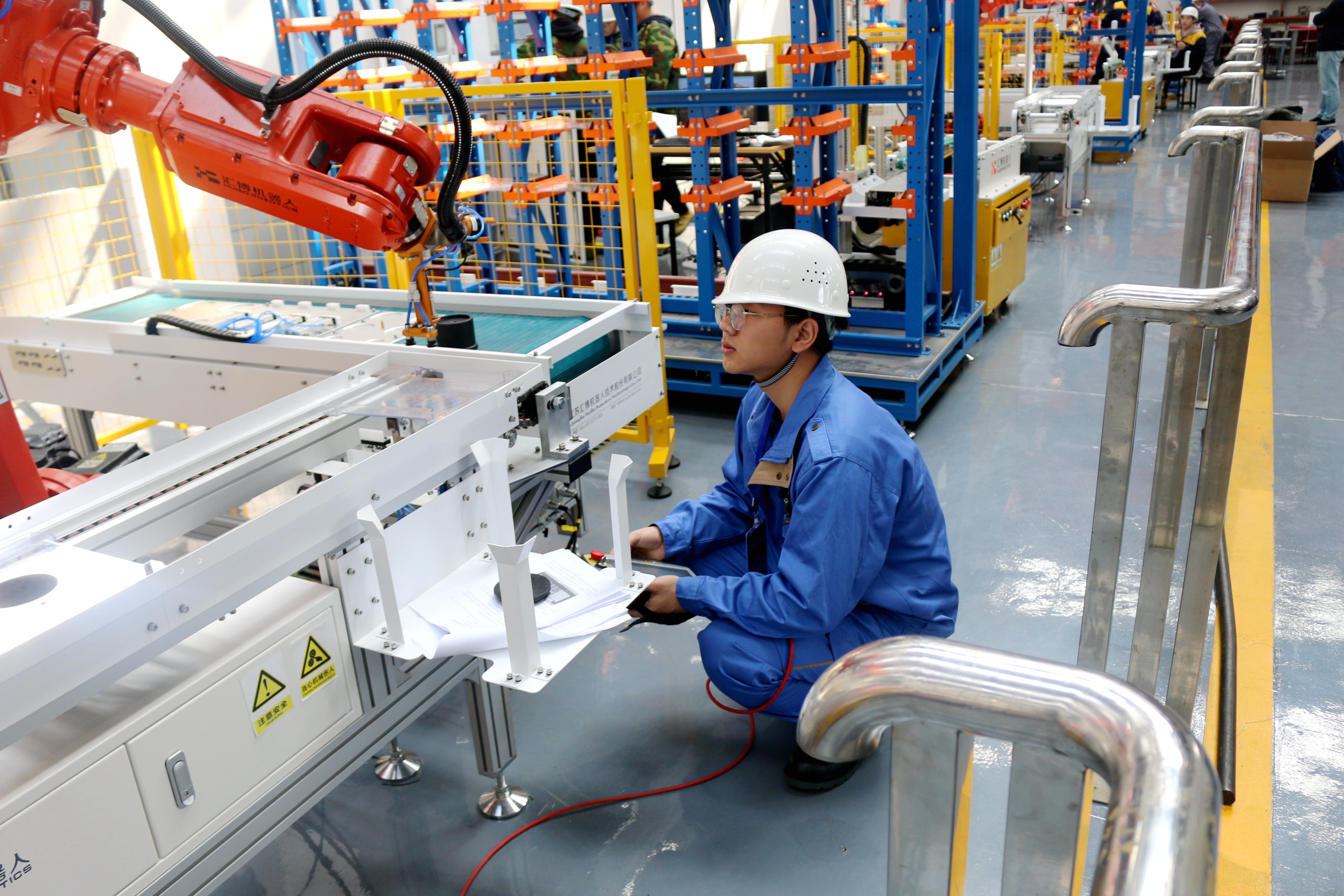 “工业机器人技术应用”赛项以工业机器人智能工作站系统作为竞赛平台,多名参赛选手协作完成工业机器人应用工作站系统中的配套设备机械电气系统的装调、工业机器人标定、通讯设臵及操作编程、视觉系统编程调试、AGV机器人及码垛机器人的编程调试等基本工作任务,并通过对系统的人机界面开发及控制程序设计等完成工业机器人智能工作站系统的联机运行和特定制造流程等综合任务。