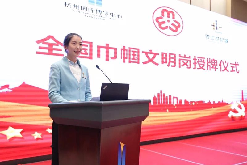 近日,我校旅游学院旅行社经营管理专业18届毕业生何羽婷所在工作团队——杭州国际博览中心高级礼仪接待组获2019年全国“巾帼文明岗”荣誉称号。在杭州国际博览中心举行的全国“巾帼文明岗”授牌仪式上,何羽婷作为杭博高级礼仪接待组代表在授牌仪式上发言。萧山区妇联党组书记、主席赵青等为获得荣誉的杭博高级礼仪接待组授牌。