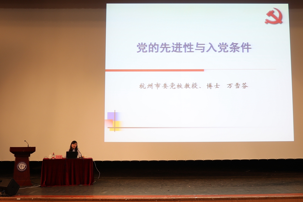教育学院学前教育专业1803班姚安安同学代表全体学员在开班典礼上作了表态发言。开班典礼结束后,由杭州市委党校党史党建与统战教研部教授、博士万雪芬作题为《党的先进性与入党条件》的第一课专题讲座。