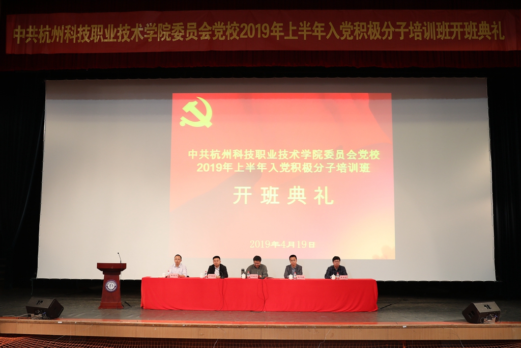 4月19日,中共杭州科技职业技术学院委员会党校2019年上半年入党积极分子培训班开班典礼在文体中心大剧场举行。党校校务委员会主任、校党委副书记何树贵,校党委委员、副校长赵悦林出席开班典礼。党校校务委员会副主任、校党委委员、组织部长罗明誉主持典礼。党校校务委员会成员,各党总支书记、组织员,二级学院学工办负责人以及477位学生入党积极分子、15位教工入党积极分子参加开班典礼。