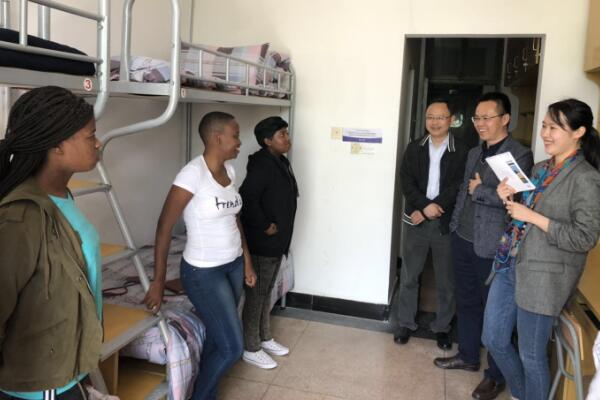 副校长赵悦林及学生处、信息工程学院负责人亲赴留学生寝室慰问看望。赵悦林对南非留学生的到来表示热烈的欢迎,希望他们努力学习专业知识、认真磨练专业技能,并能享受在杭科院的的学习生活。