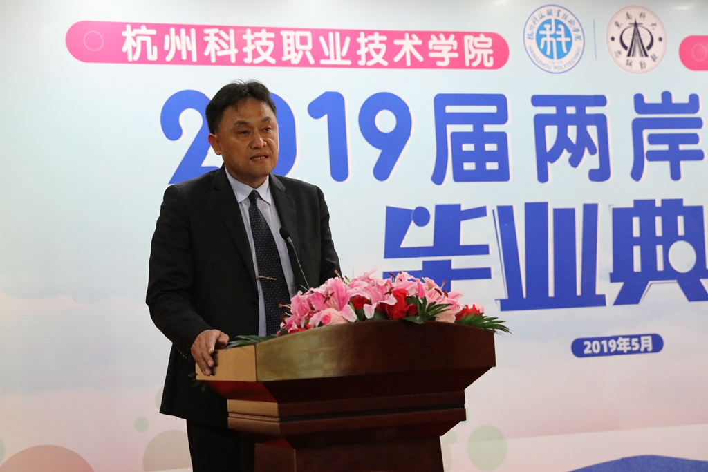 许淑燕代表学校向毕业班的34名同学表示祝贺,肯定了第二届两岸合作班毕业生在校学习的出色表现。“学校永远是你们的精神港湾,要相信梦想的力量,”许淑燕嘱托同学们,“要以工匠精神为责任担当,以专注执着坚守立业初心,以知行合一激扬青春力量。”许淑燕回顾了杭科院与东南科技大学四年来的办学合作历程,希望两校合作继续深入,共享教育理念和教育资源,深化友谊,为两岸教育合作作出新贡献。