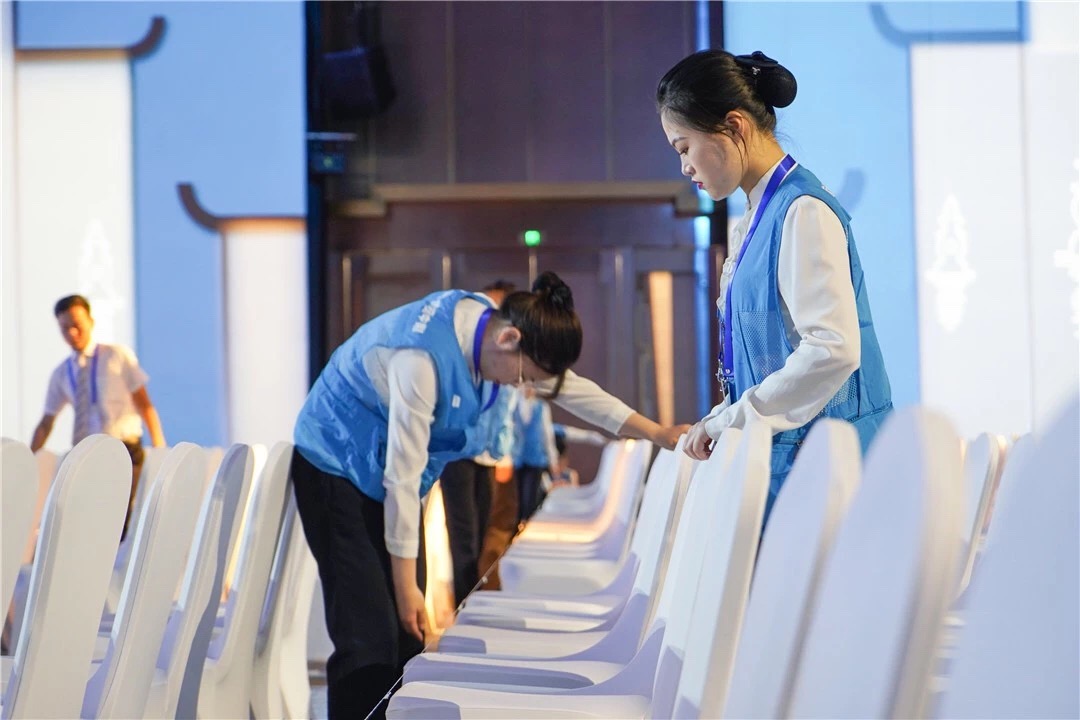 6月13日上午,在“双创周”启动仪式上,我校25名志愿者为参会领导、企业家、参展商以及观众提供场馆指引和茶水、接待服务。一场会议两三个小时不间断,志愿者们需要精神高度集中,不允许有半点差错。当天活动紧凑,志愿者们也放弃吃饭和休息,一直坚守在自己的岗位上,保障各项会议、论坛、展览等活动顺利开展。