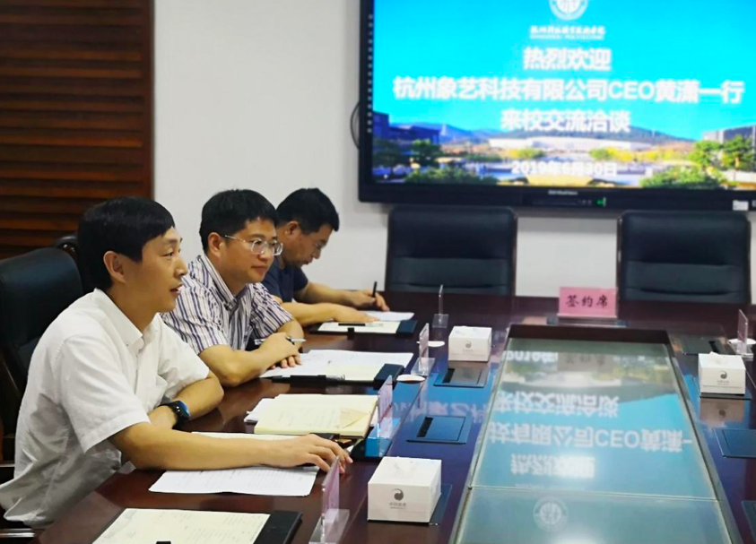 为了充分发挥学校人才培养、技术研发和服务社会的功能,加强学校与企业的紧密合作,实现专业与产业、企业、岗位对接,2019年6月30日,我校与杭州象艺科技有限公司签订合作协议。副校长寿伟义,杭州象艺科技有限公司CEO黄潇,集团副总裁唐佳明、胡慧敏、谭丁峰出席当天的签约仪式。教务处、产学合作处、校资产经营公司及艺术学院相关负责人参加签约仪式。