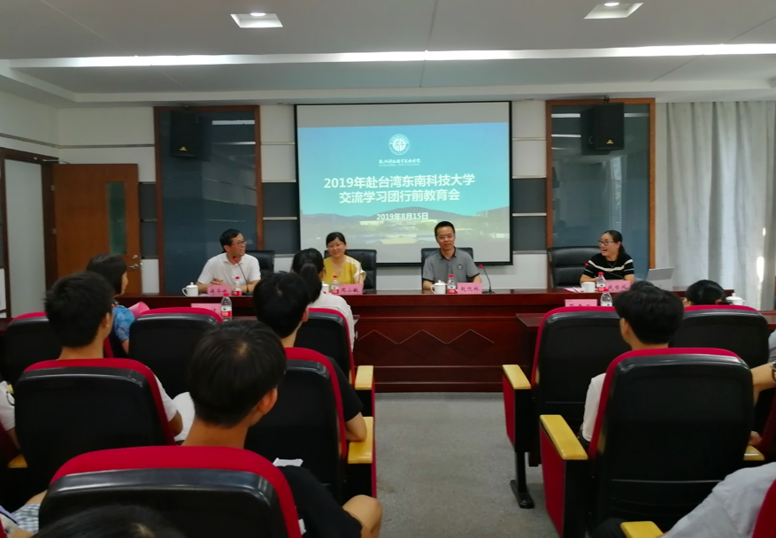 8月15日,我校召开了2019年赴台湾东南科技大学交流团行前教育会。副校长赵悦林、杭州市台办对台交流服务中心主任周小敏出席了会议。台港澳办公室、党委组织部、党委保卫部、党委学生工作部、国际教育处等部门负责人及相关人员、2019年赴台湾东南科技大学交流团全体成员参加了会议。