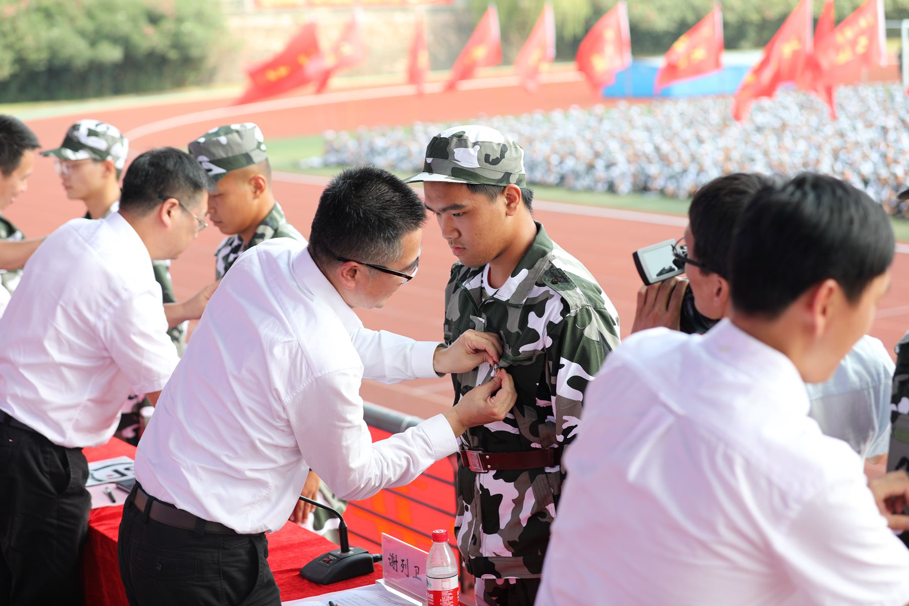 开学典礼上,校领导们亲手为新生代表佩戴了校徽,祝贺大家正式开启大学生涯。