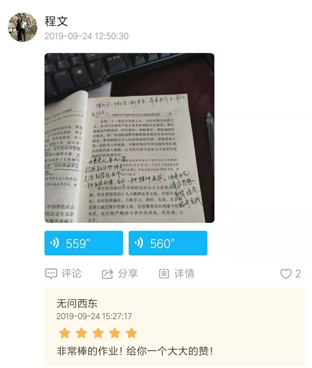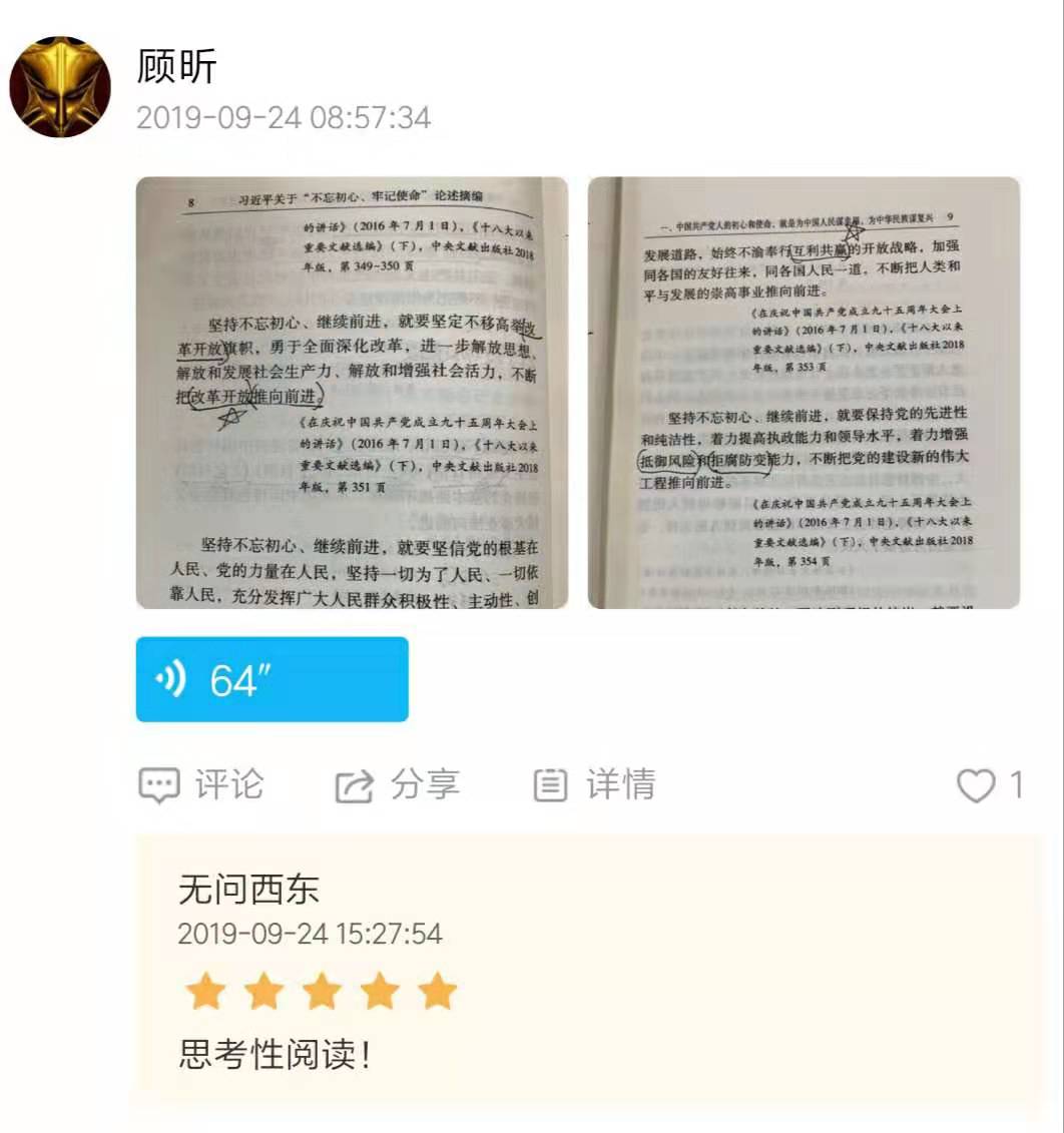 本次活动主要围绕“读经典、听初心、评党性”三个方面开展。借助微信签到平台,党员们每天上传《习近平关于“不忘初心、牢记使命”论述摘编》、《习近平新时代中国特色社会主义思想学习纲要》与《中国共产党党章》等理论著作的阅读篇章与朗诵片段。上传后,党员之间还需要相互收听收看,并在留言区进行点赞与评论,真正做到互观互检找差距、互学互鉴促提升。
