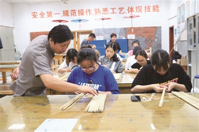 在实践过程中,艺术设计学院积极探索文化育人的有效路径,将传统文化与现代艺术相融合,打造校园文化品牌——“传承非遗文化,点亮创意之光”,加强文化育人。“我们把‘立德树人’作为教育的根本任务,将新中国成立70周年、社会主义核心价值观等红色元素融入非遗作品创作,做到艺术与历史相结合,艺术与信仰相结合,艺术与时代相结合。”汪晟说,接下来,艺术设计学院还将引入其他非遗项目,“说不定,下一个非遗传承人就在这些学生中间产生。”