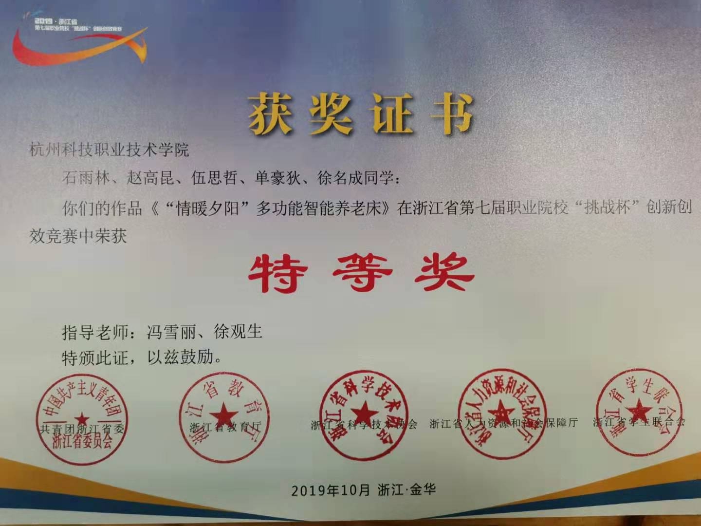 由冯雪丽、徐观生老师指导的《“情暖夕阳”多功能智能养老床》项目喜获大赛特等奖与最佳创意奖。多功能智能养老床集机械技术、计算机技术、机电一体化技术、语音控制技术、传感器技术与“互联网+”技术六大技术于一体,主要包括基本功能、休闲阅读功能、锻炼养生功能、陪护功能四大模块,下设27个子功能,可有效改善老年人睡眠质量和生活品质,提高老年人自理能力。项目立意深刻,实用性强,得到大赛评委的一致好评,成为进入决赛公开答辩环节的五个优质项目之一。公开答辩环节的评审专家倪涯评价:“养老床项目注重创业创新的公益性,有较大的市场空间,结构设计合理,功能实用,是一项优秀的大学生创业创新作品。”