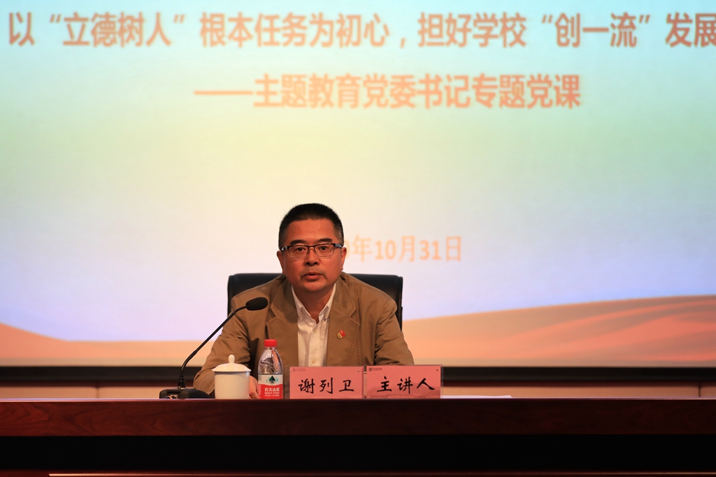 在深入开展“不忘初心、牢记使命”主题教育理论学习和调查研究的基础上,10月31日,校党委书记谢列卫讲了一堂题为“以‘立德树人’根本任务为初心,担好学校‘创一流’发展使命”的专题党课。省委主题教育第十二巡回指导组副组长徐龙仁、组员廖小清,全体校级领导出席专题党课,校党委副书记何树贵主持专题党课,全体中层干部、校属企业负责人、党支部书记、专职组织员、民主党派和无党派人士代表、师生党员代表等近200人参加党课。