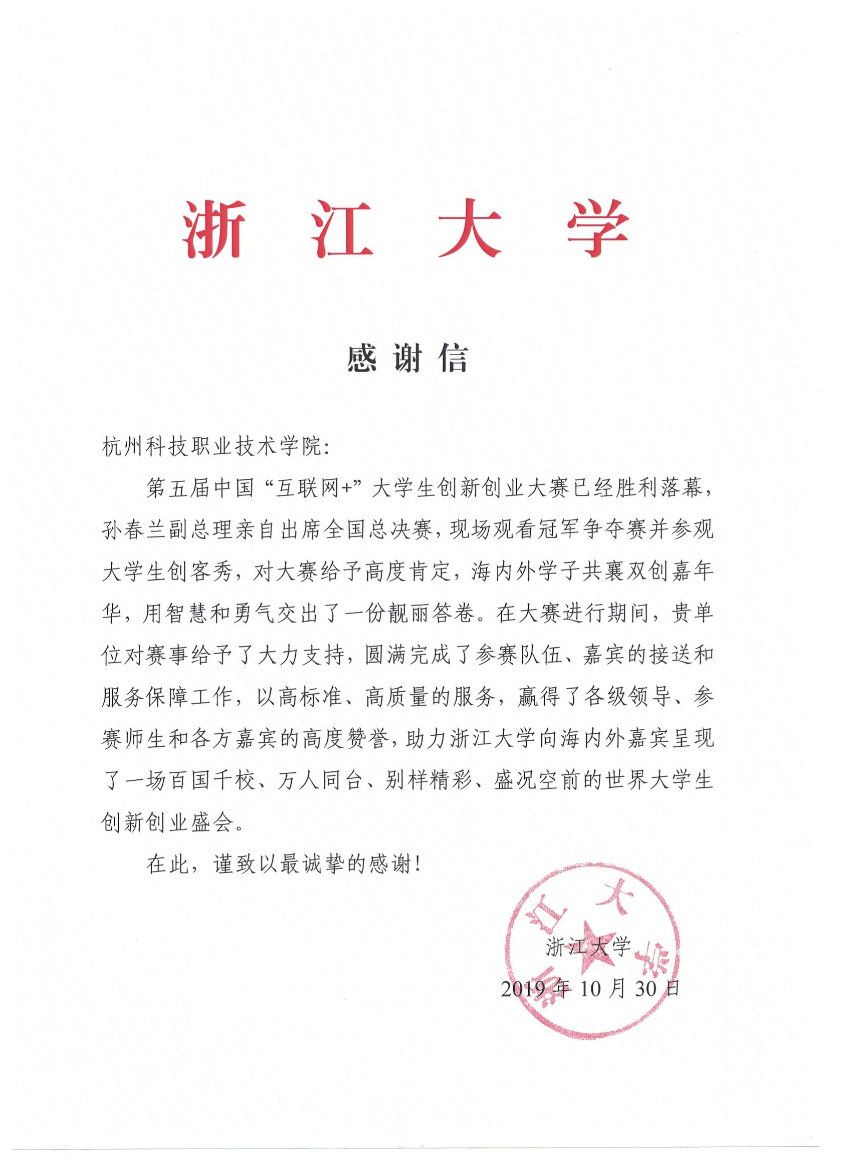 近日,第五届中国“互联网+”大学生创新创业大赛承办单位浙江大学发来感谢信,对我校师生在第五届“互联网+”大赛总决赛接待过程中高标准、高质量的服务表示感谢。