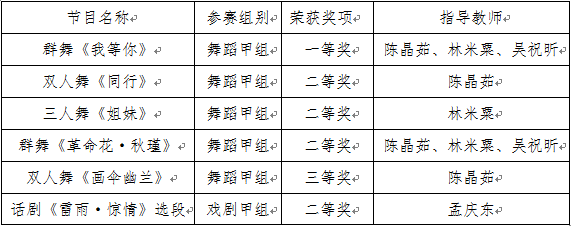 本次大学生艺术节以“民族魂•中国梦”为主题,分舞蹈、戏剧、校园十佳歌手等3个赛项,共有97所高校、544个节目参赛。由陈晶茹、林米粟、吴祝昕三位老师指导的群舞《我等你》荣获舞蹈甲组一等奖,这是我校第二次获得该奖项。