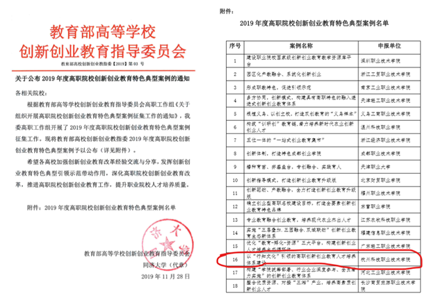近日,我校《以“行知文化”引领的高职创新创业教育人才培养体系建设》被教育部高等学校创新创业教育指导委员会评为2019年度高职院校创新创业教育特色典型案例。这是我校近年来创新创业教育人才培养体系建设取得的又一成果,为我校创新创业教育工作的改革开创了新局面。