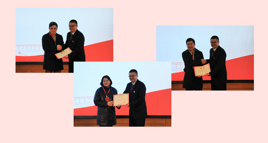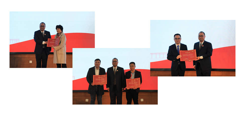 副校长袁俊代表学校向校友捐赠个人代表郑美金,校友会代表、城市建设学院校友会常务理事沈卫东,校友企业代表袁红军、黄潇颁发捐赠证书。