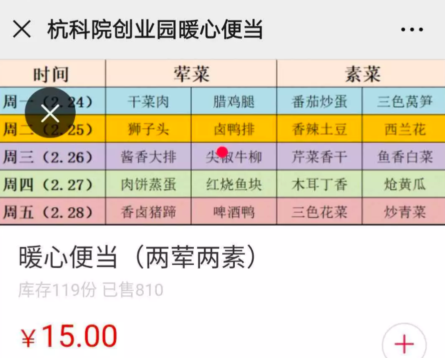 除了帮助企业“开源节流”,园区还为企业的开工解决后顾之忧。因为防疫需要,绝大多数员工自己带饭盒上班,但是依旧有数十位员工的午餐问题得不到解决。针对这一问题,园区积极与学校食堂沟通,推出了15元一份的暖心套餐,每周公布菜单,员工可通过在线平台预定,“饭菜由园区工作人员代拿代送,员工们只要动动手指,足不出户就能吃到卫生、可口的饭菜”。