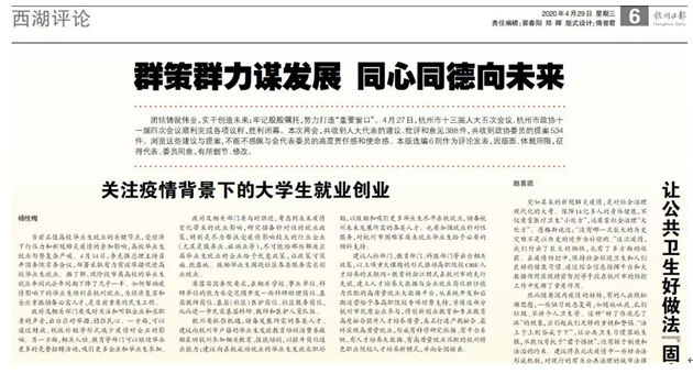 今年人大会议开始前,针对疫情背景下高校毕业生就业的严峻形势,杨悦梅经过多方调研后提交了《疫情背景下大力支持高校毕业生就业创业的建议》,提出了五点建议,尤其是建议杭州抓住机遇、出台政策、储备发展所需人才;向在杭成功就业的毕业生发放求职补贴;建立人才培养大数据与企业就业岗位胜任能力匹配的高质量就业大数据平台。该建议案获得相关部门认可,全文刊发在4月29日杭报A06版。