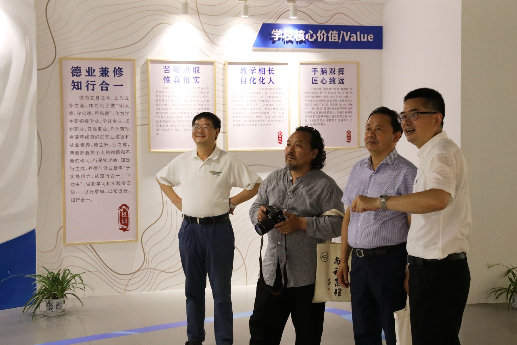 在参观了我校杭州陶行知研究馆、校史馆和校园文化景观中轴线规划区域后,吕德雄赞许我校坚持师陶、学陶的传承意识与实践精神,认为我校很好地总结了湘湖师范这所由陶行知先生一手指导创办的历史名校的办学经验,文化史料积累丰富,展呈多样化,值得其他院校学习,“我这是第四次来到杭科院,感觉一次比一次好”。吕德雄希望我校进一步挖掘行知文化底蕴,增强校园景观的行知文化元素,打造校园文化“大课堂”,在高等教育院校学陶、传陶中发挥更大作用。“相信杭科院坚持研陶、用陶,一定能提升办学实力,创造一流文化。”