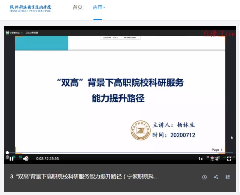 杨林生教授带来了题为《“双高”背景下高职院校科研服务能力提升路径》的专题讲座,他从“双高”建设背景出发,围绕树立科研意识、打造科研团队、搭建科研平台、完善科研制度、提升科研能力以及教师科研建议等六个方面展开,强调了提升学校总体科研水平对“双高”建设的重要性和必要性。