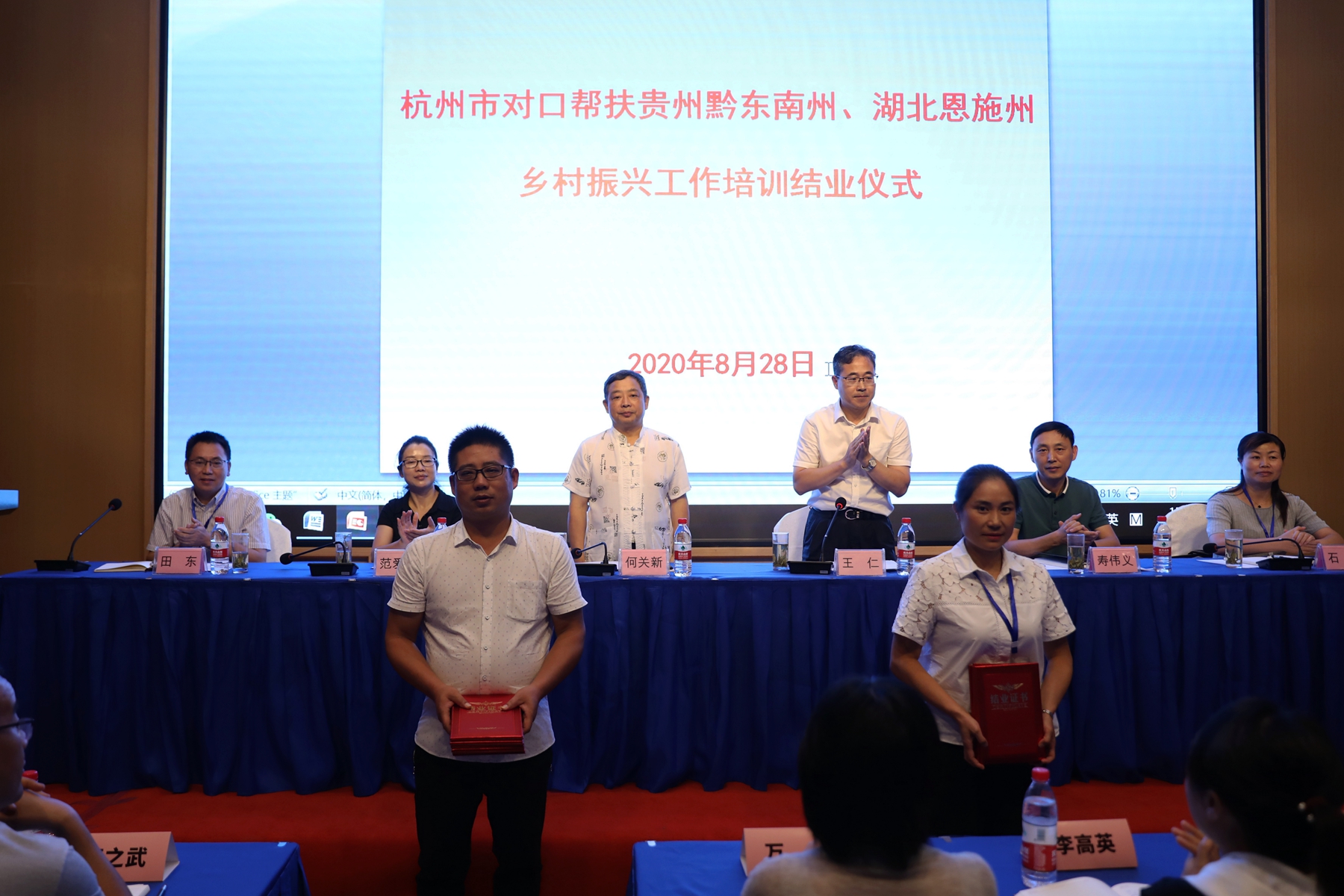 8月28日,杭州市对口帮扶贵州黔东南州、湖北恩施州乡村振兴工作首期培训班结业仪式在我校曙光薇酒店曙光厅举行。杭州市政府副秘书长王仁,杭州市乡村振兴学院理事长何关新,杭州市对口支援和区域合作局副局长、黔东南州驻杭办事处主任范爱红,乡村振兴学院副理事长兼秘书长、杭州科技职业技术学院副校长寿伟义,黔东南州农业农村局党组成员石红,恩施州农业农村局副局长田东出席。杭州市对口帮扶首期培训班80名学员参加结业仪式。