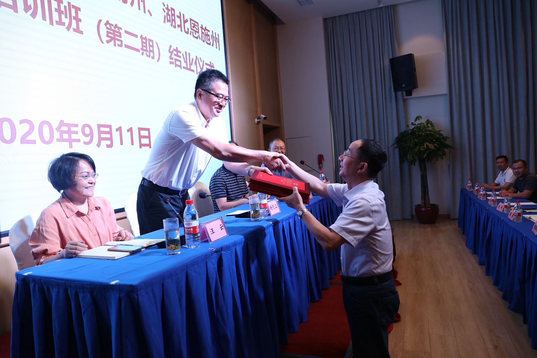 9月11日,杭州市对口帮扶贵州省黔东南州、湖北省恩施州乡村振兴工作二期培训班结业仪式在我校曙光薇酒店曙光厅举行。黔东南州委组织部副部长潘秀宇,恩施州委农办主任、农业农村局局长汪云,杭州科技职业技术学院党委书记谢列卫出席会议。来自黔东南州、恩施州两地参训的80位州、县领导学员参加仪式。