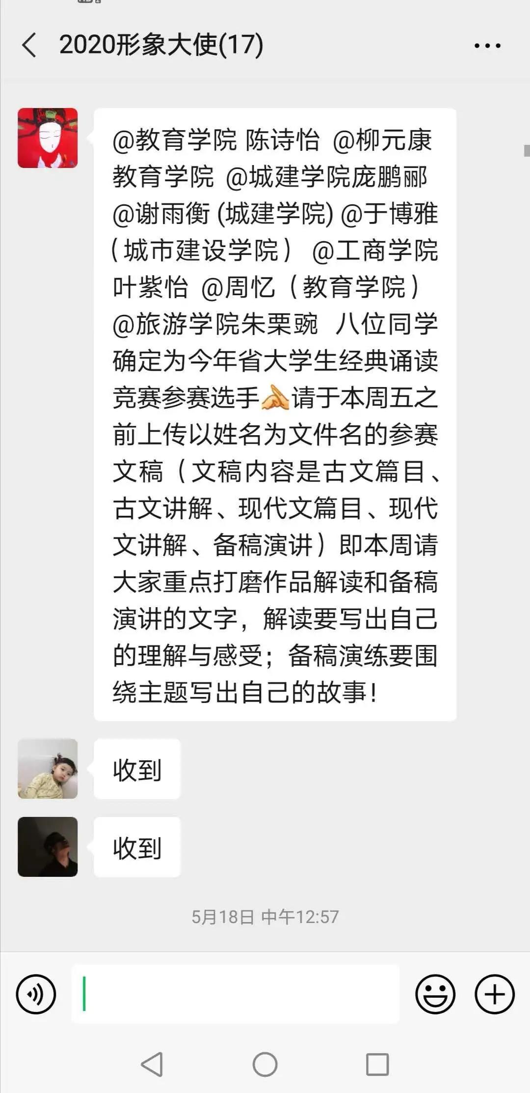 一年一度秋风劲,经典诵读传佳音。日前,由浙江省语言文字工作委员会、浙江省大学生科学竞赛委员会主办的浙江省第八届中华经典诵读竞赛成绩揭晓。我校庞鹏郦、朱栗豌、柳元康、谢雨衡四位同学在专科个人组比赛中均斩获一等奖,陈诗怡、叶紫怡、于博雅、周忆四位同学获得专科个人组三等奖,南非留学生Gwazela Apelele获留学生组三等奖。此外,王强、解连珊、钱世凤、方岚、孟庆东五位指导老师荣获本届大赛“优秀指导教师”荣誉称号,我校荣获大赛“优秀组织奖”,取得我校参加省大学生中华经典诵读大赛以来的最好成绩。