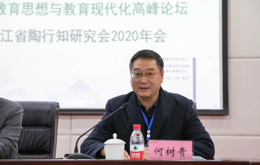 何树贵致欢迎辞。他表示,由陶行知先生指导创办的浙江湘湖师范学校是学校办学的重要渊源。近年来,学校不断深化行知文化的研究和传承,践行陶行知生活教育理论,弘扬“爱满天下”的学校精神,在办学质量、产教融合和社会服务等方面取得丰硕成果。学校高度重视本次大会的召开,将全力以赴作好大会服务工作,为与会人员提供好后勤保障。