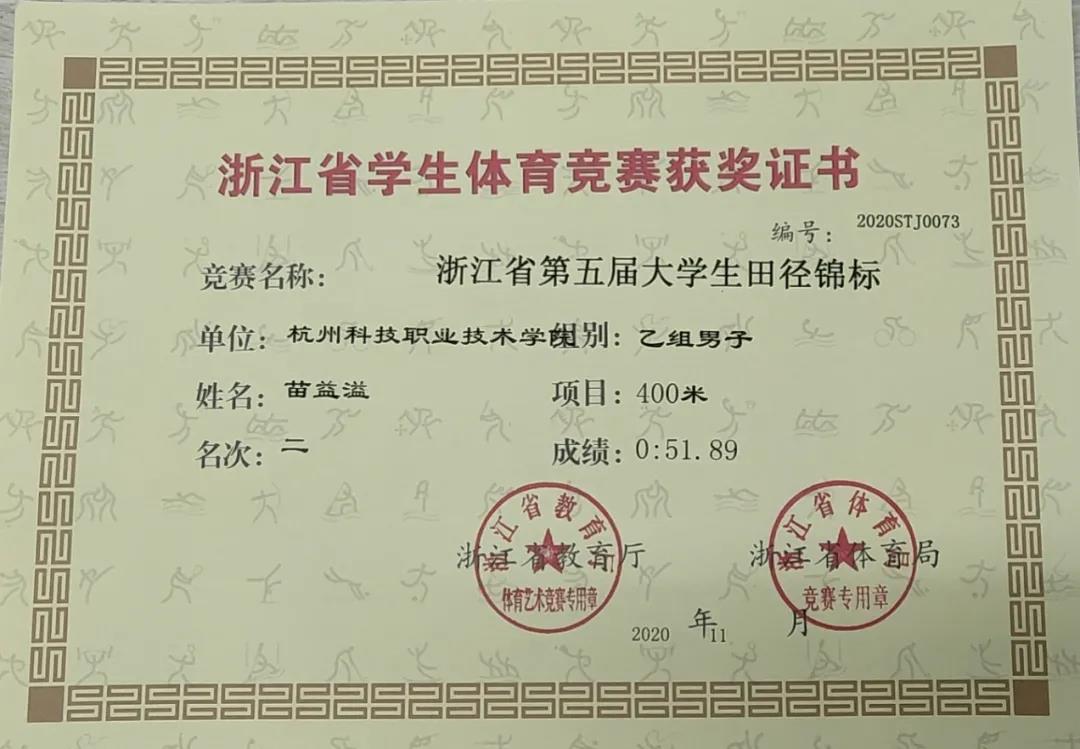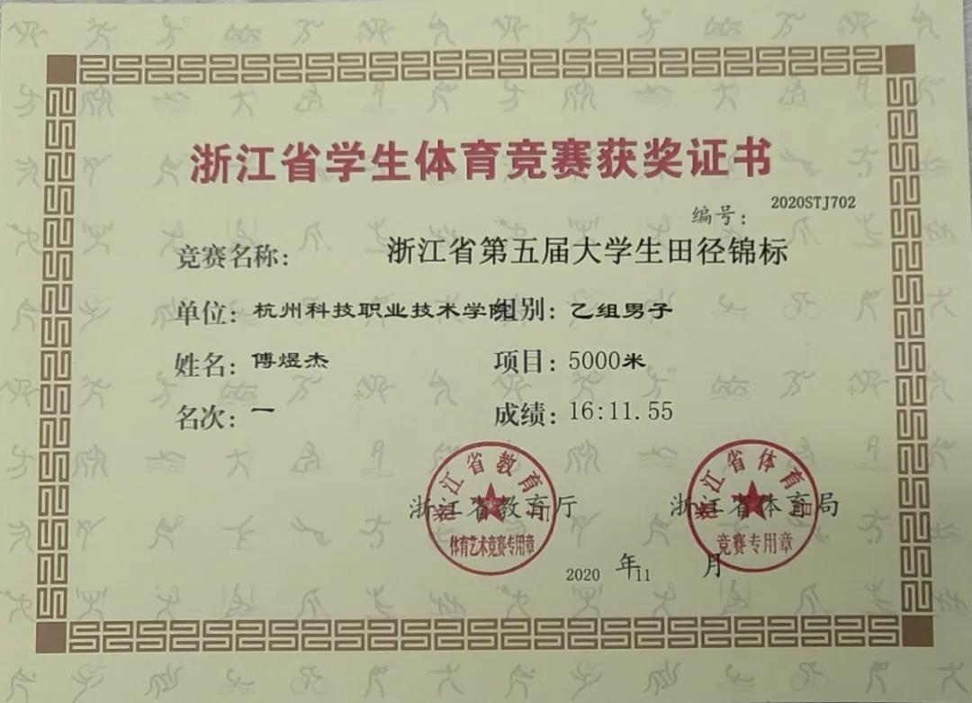 比赛中,工商学院傅煜杰同学勇夺乙组男子5000米冠军和1500米亚军,其中5000米以16分11秒55的成绩打破浙江省大学生田径锦标赛乙组5000米赛会纪录,同时刷新由他保持的校运会记录。由傅煜杰、苗溢益、孙明浩、李义组成的4×400接力队以打破我校校运会记录的成绩获得赛会季军;机电工程学院苗益溢同学获得男子400米亚军、200米第六名;机电工程学院李义同学获得男子1500米第4名、5000米第七名;旅游学院张晨倩同学获得女子七项全能第七名;艺术学院李思薇同学获得女子七项全能第八名。