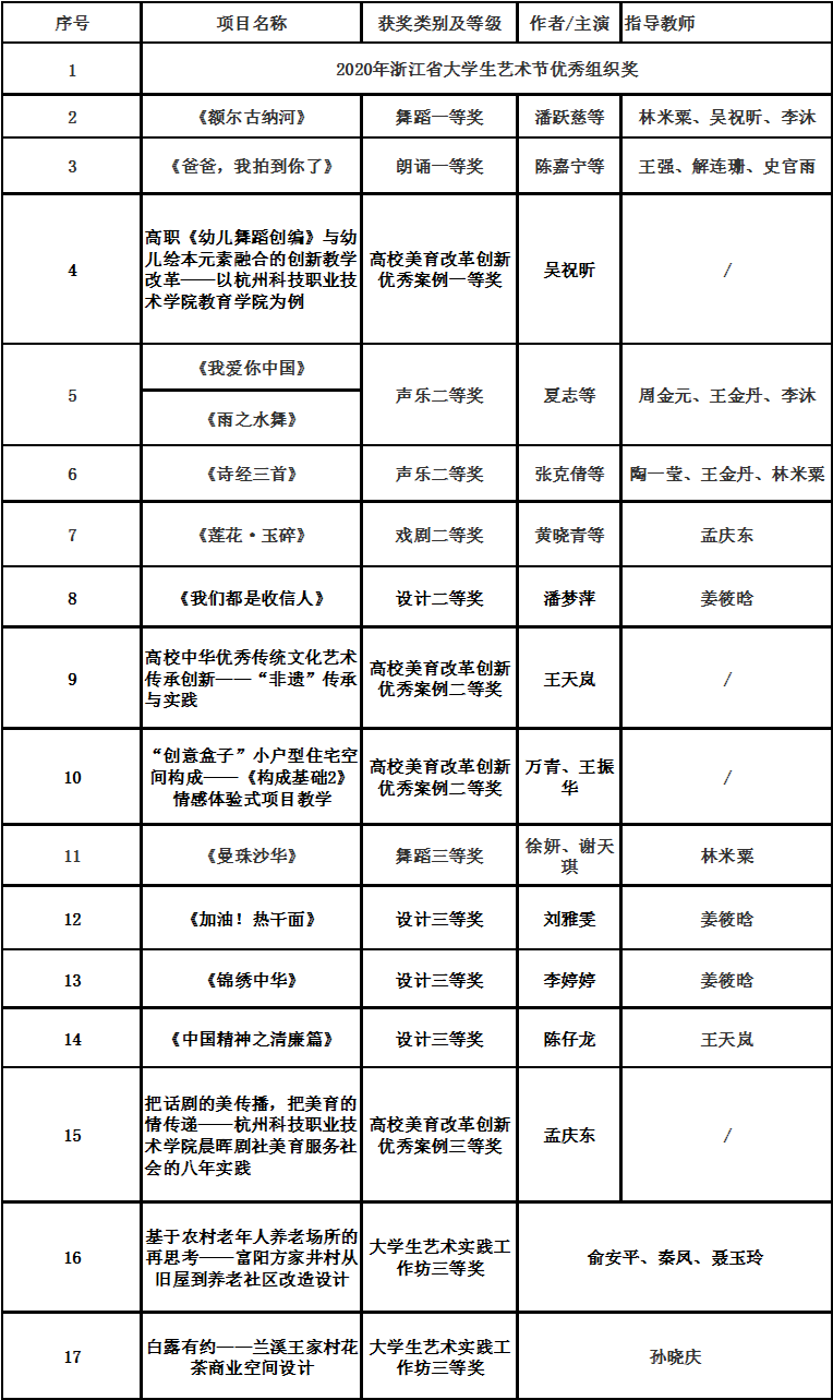 近日,2020年浙江省大学生艺术节在杭州圆满落幕,我校师生共斩获3项一等奖、6项二等奖、7项三等奖及艺术节优秀组织奖等17个奖项,获奖总数创我校参与此项赛事的最好成绩。