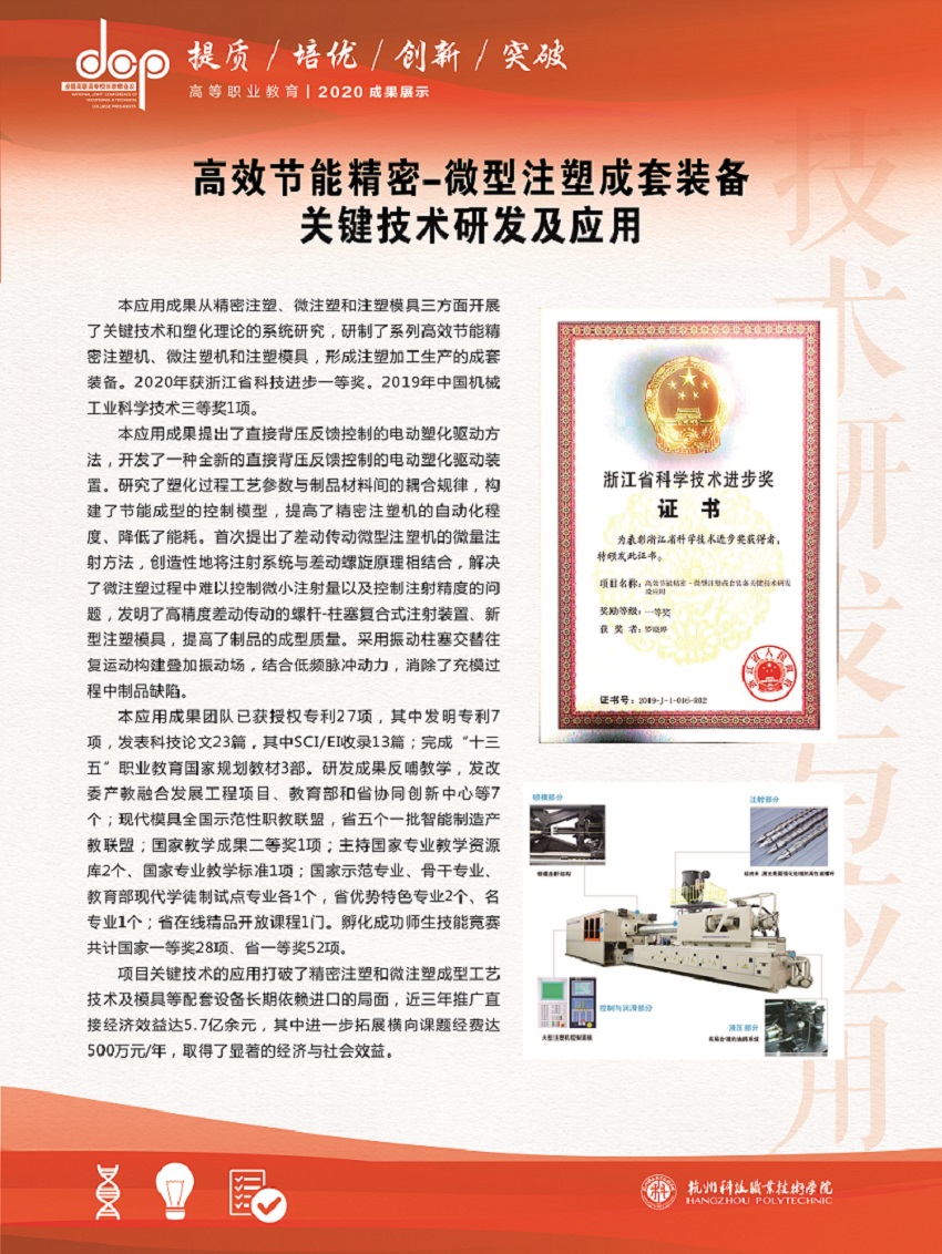 《高效节能精密-微型注塑成套装备关键技术研发及应用》从精密注塑、微注塑和注塑模具三方面开展了关键技术和塑化理论的系统研究,研制了系列高效节能精密注塑机、微注塑机和注塑模具,形成注塑加工生产的成套装备,2019年获得中国机械工业科学技术三等奖,2020年获浙江省科技进步一等奖。成果关键技术的应用,打破了精密注塑和微注塑成型工艺技术及模具等配套设备长期依赖进口的局面,近三年推广直接经济效益达5.7亿余元,进一步拓展的横向课题经费达500万元/年,取得了显著的经济效益与社会效益。